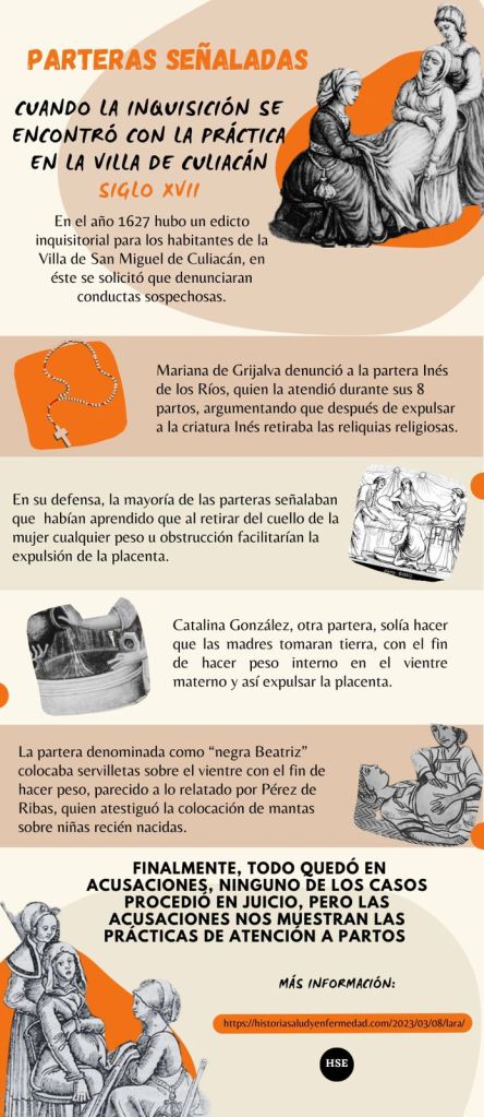 Entre los vecinos que se acercaron, destacan Mariana de Grijalva, una española que -después de ocho partos- se enteró que no había hecho lo correcto al momento de dar a luz.2 Su partera de confianza, Inés de los Ríos, hasta entonces había seguido lo que consideraban era el protocolo de alumbramiento, sin sorpresas que comentar. Sin embargo, después de ese edicto inquisitorial, Mariana entendió que la práctica de Inés era condenable para los buenos cristianos.